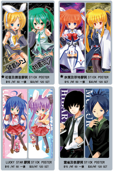初音setB: 初音本 + 初音及鏡音stick poster + VOCALOID全家墊板+VOCALOID全家襟章+V家特別書簽一張=$95 NT.380 (原價:$123 NT.492) |